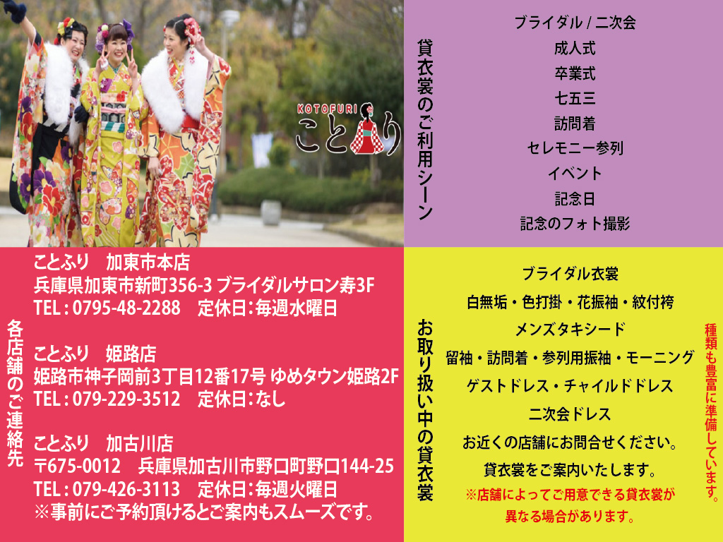 兵庫県加東市で成人式の振袖と卒業式女子袴、ブライダルや二次会のドレスなどのレンタル衣裳を行っている。また業歴も長く数多くのお客様と繋がりを持って接してきた。詳しくはホームページをチェック。