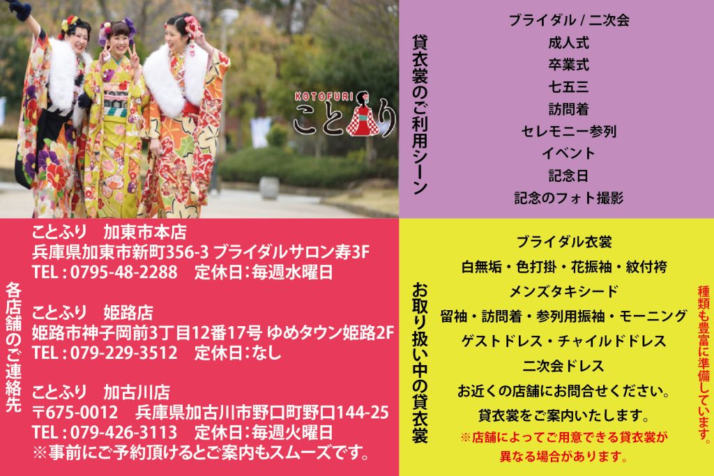 兵庫県加東市新町356-3(本店、他2店舗)で成人式の振袖と卒業式女子袴、ブライダルや二次会のドレスなどのレンタル衣裳を行っている。また業歴も長く数多くのお客様と繋がりをもって接してきた。詳しくはホームページをチェック。ご予約もぜひ!